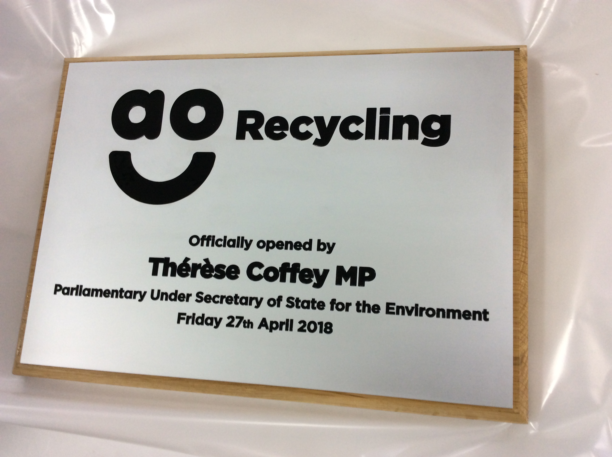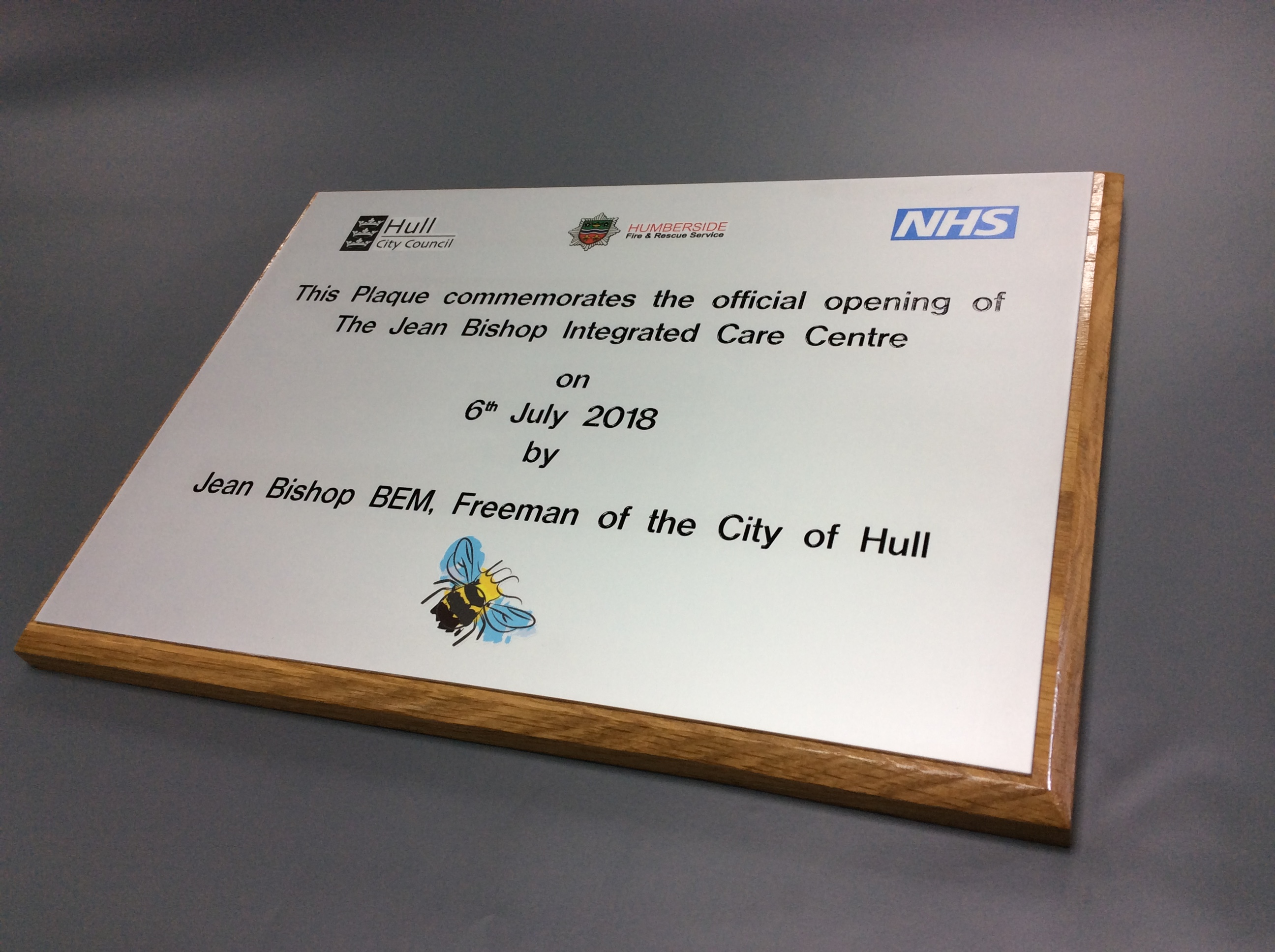Manufactured from finest anodised aluminium. Your plaque can optionally be mounted onto solid light oak, which can then be stained to your bespoke requirements.